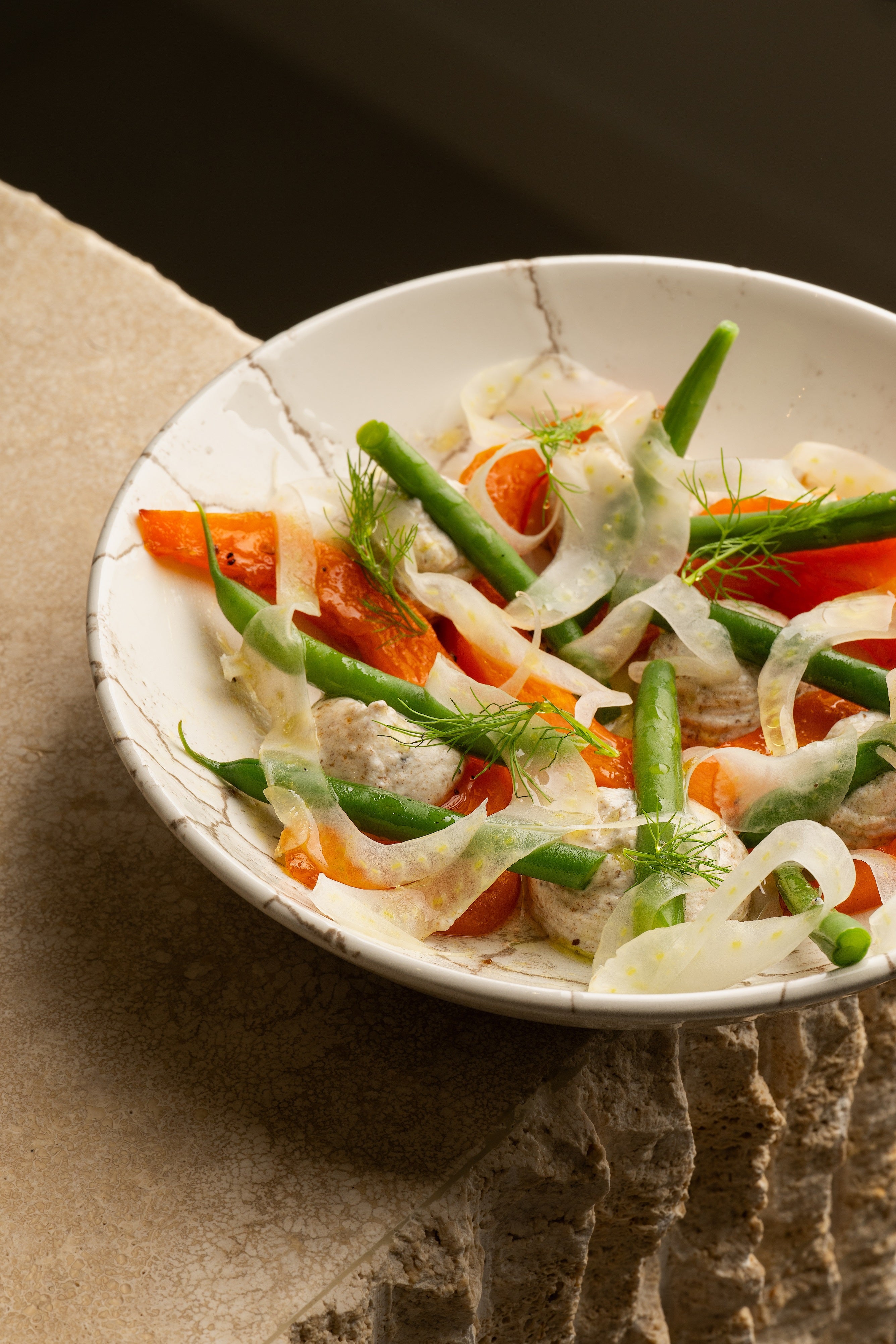 El cremoso de ricotta con tartufata Laumont aporta frescor y untuosidad, mientras que la judía verde suma textura y las láminas finas de hinojo crudo aportan un contrapunto anisado y crujiente.