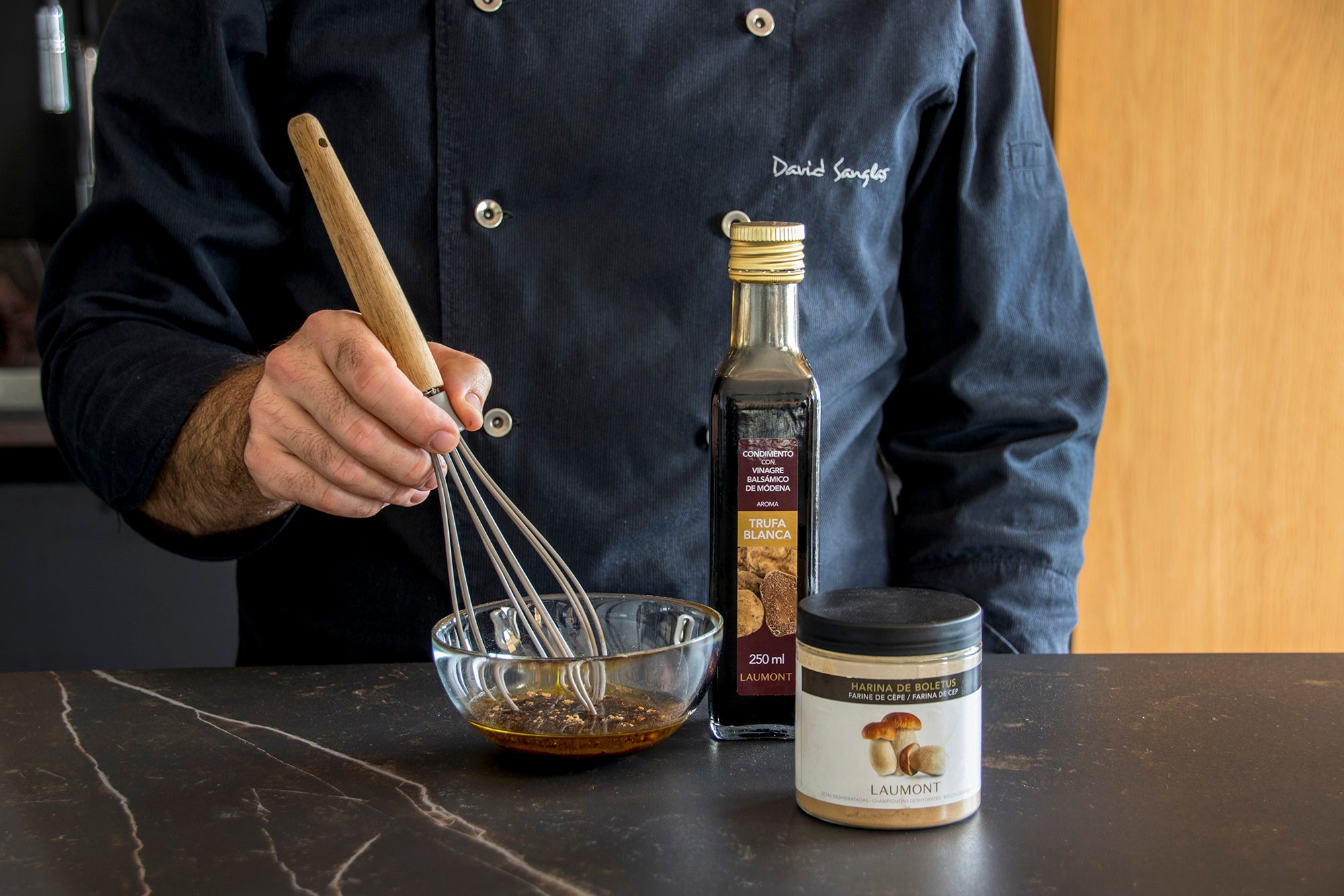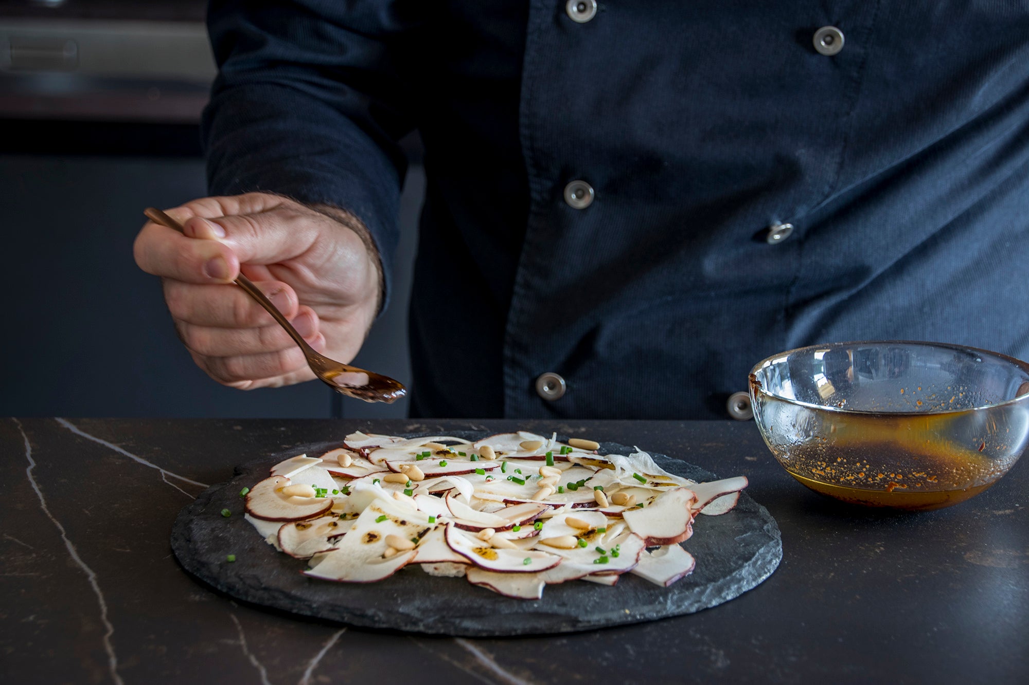 Este carpaccio de boletus con vinagreta de trufa blanca es una oda a la sencillez y al producto de calidad. Los boletus frescos, laminados con precisión y servidos crudos, se realzan con una vinagreta a base de harina de boletus y vinagre de trufa blanca Laumont, que potencia su sabor de forma natural. Coronado con yema de huevo, flor de sal y piñones, este entrante se convierte en una experiencia delicada, aromática y muy elegante.