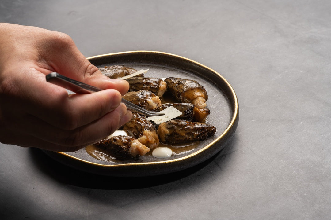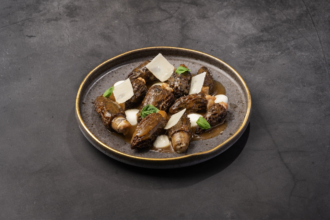 Una receta de alta cocina que rinde homenaje a uno de los hongos más apreciados por los chefs: la colmenilla. En esta propuesta, las colmenillas de Laumont se rellenan con una mezcla untuosa de carne de cerdo y foie, se acompañan con una intensa salsa de fondo oscuro de pollo asado y se equilibran con la suavidad láctica de una crema fresca ligeramente ácida. El resultado es un plato sofisticado, ideal para menús de degustación o celebraciones especiales, donde el producto gourmet de Laumont es el auténtico protagonista.