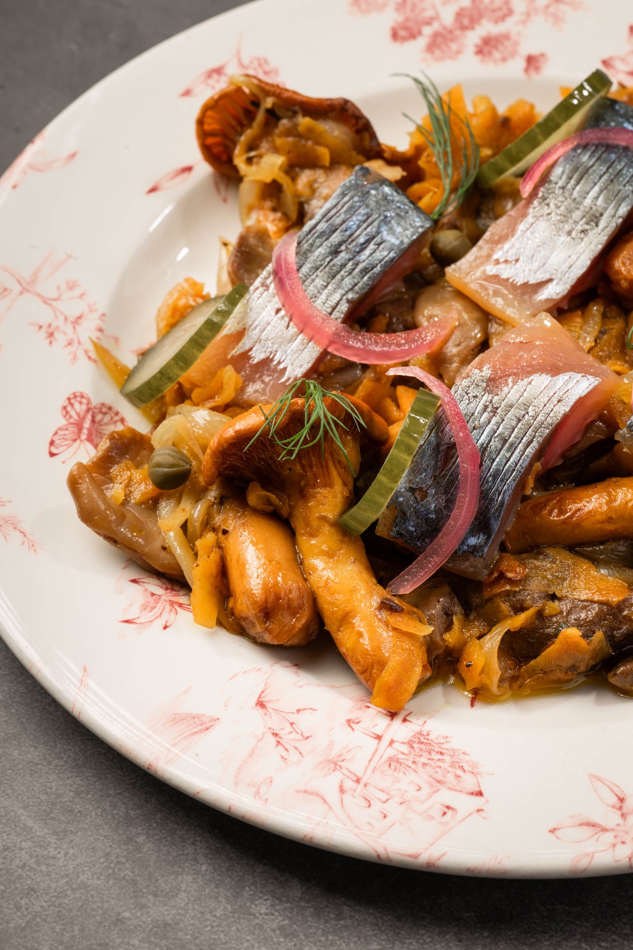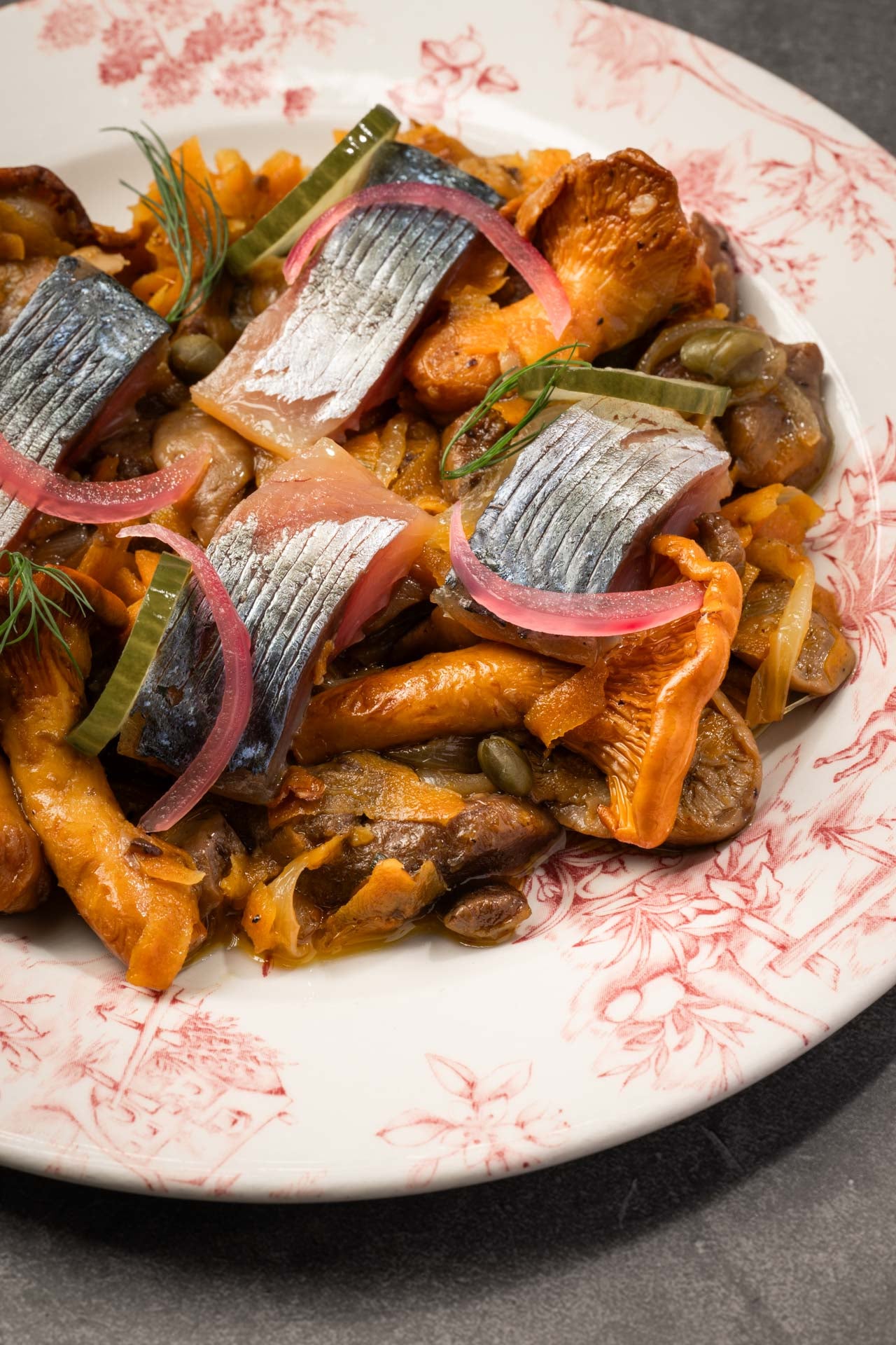 Las verduras confitadas en escabeche aportan dulzor y equilibrio, mientras que los encurtidos de cebolla morada y pepinillo y el eneldo fresco añaden un toque aromático y de color que equilibra el conjunto.