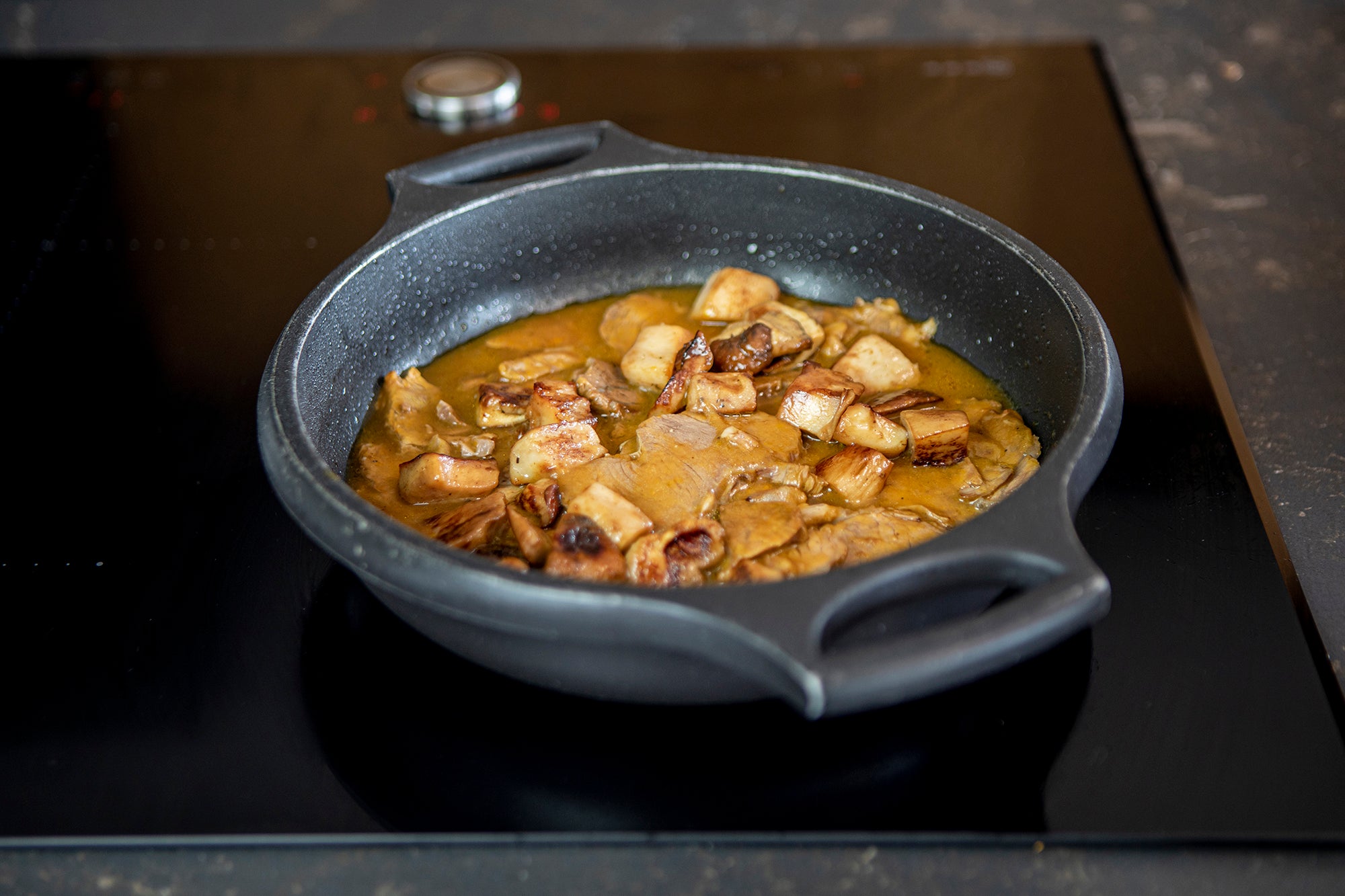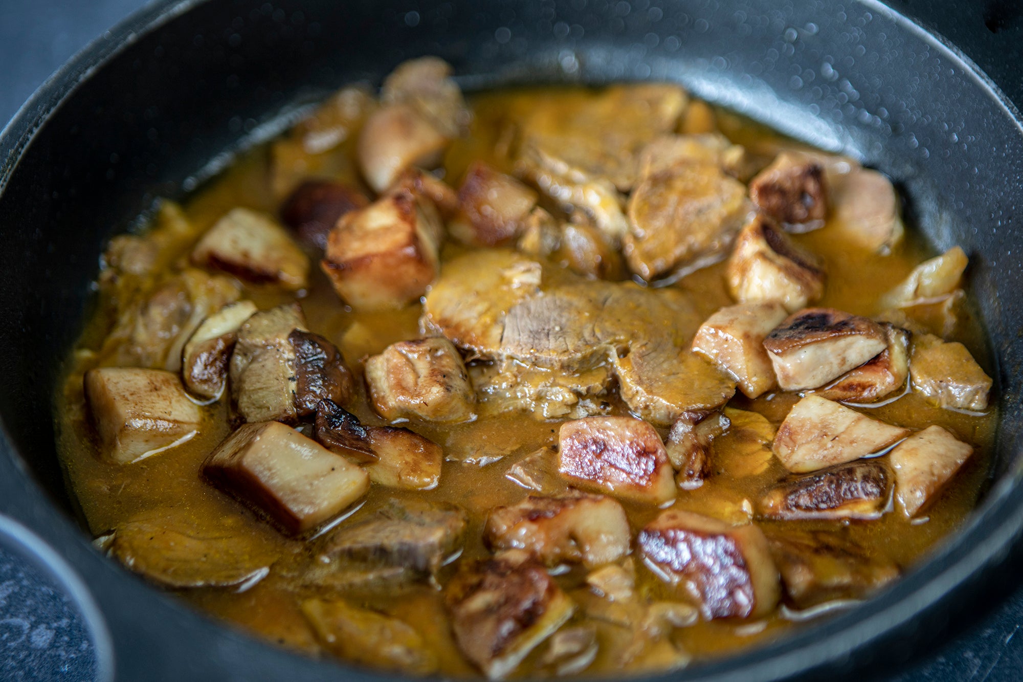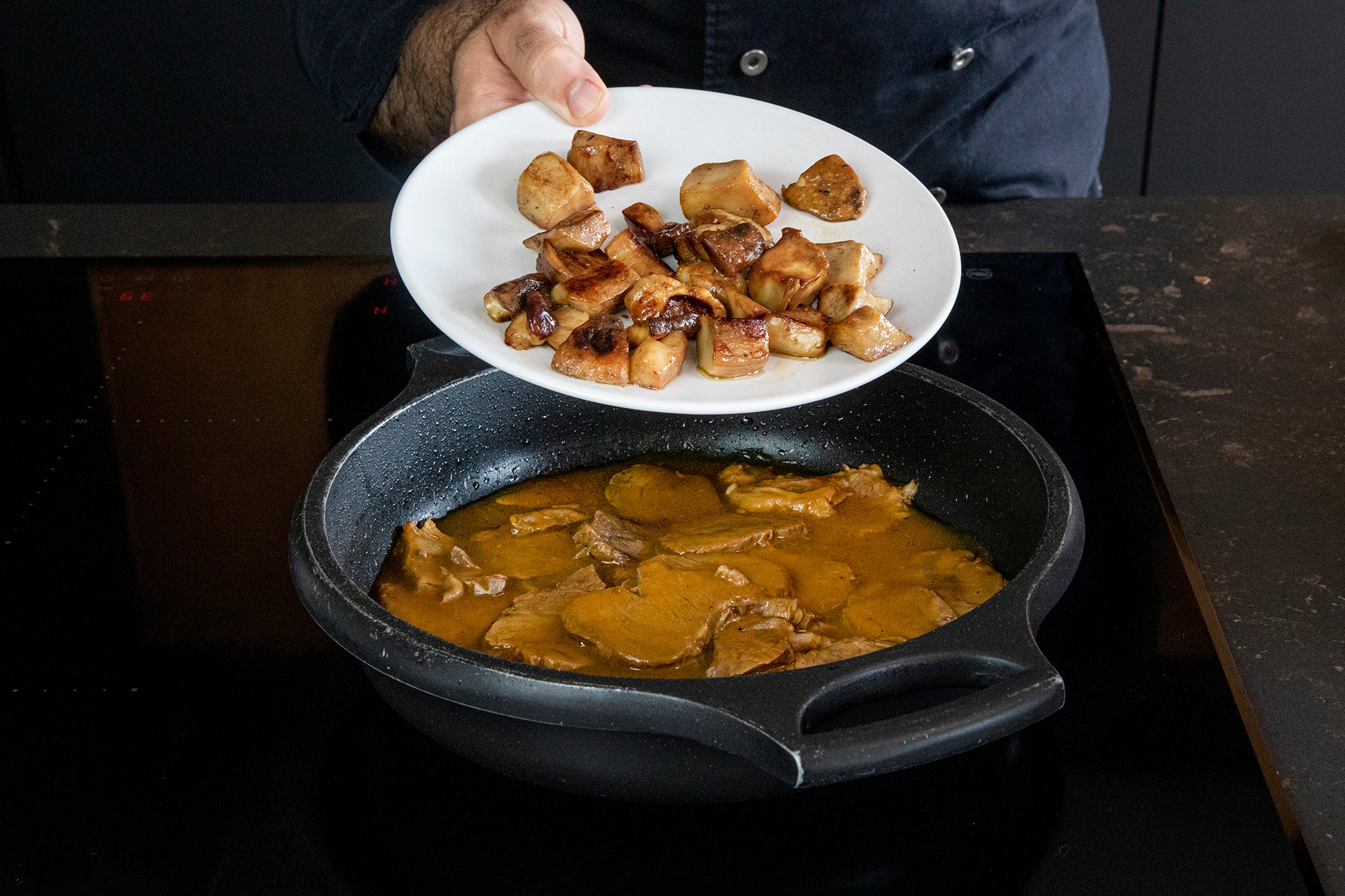Esta ternera guisada con setas es un plato reconfortante, ideal para los días fríos. Se elabora lentamente, permitiendo que el redondo de ternera se impregne de los aromas del vino rancio, las verduras y el caldo de carne. El toque final de boletus Laumont aporta una profundidad de sabor que eleva el guiso a un nivel superior. Una receta clásica, sabrosa y perfecta para reuniones familiares o comidas de domingo.