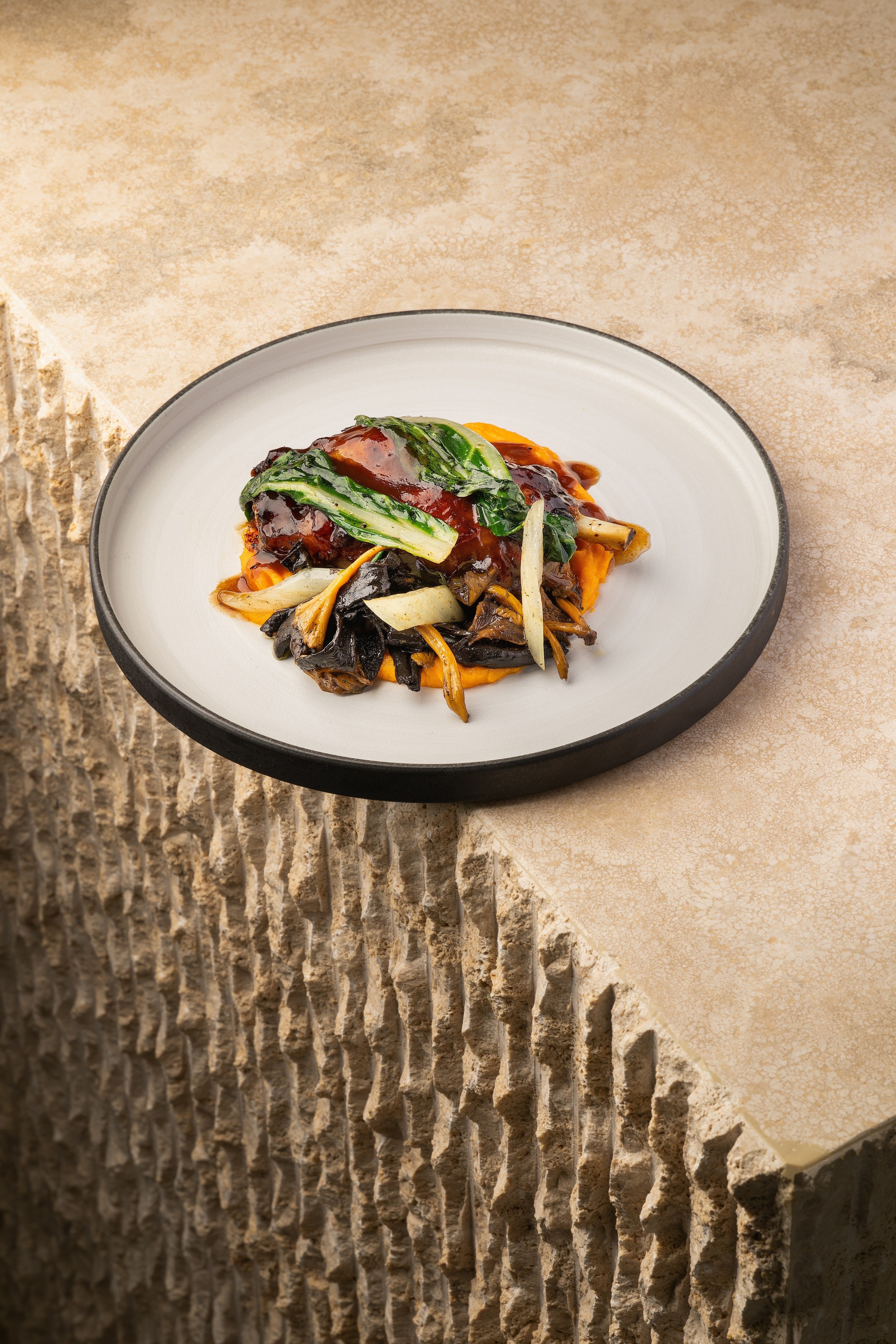 El jugo resultante de la cocción se reduce y se liga para obtener una salsa brillante y concentrada, que acompaña al jarrete junto a un cremoso de boniato asado y un salteado de acelga, trompeta de la muerte y gula de monte, terminado con ajo y perejil.