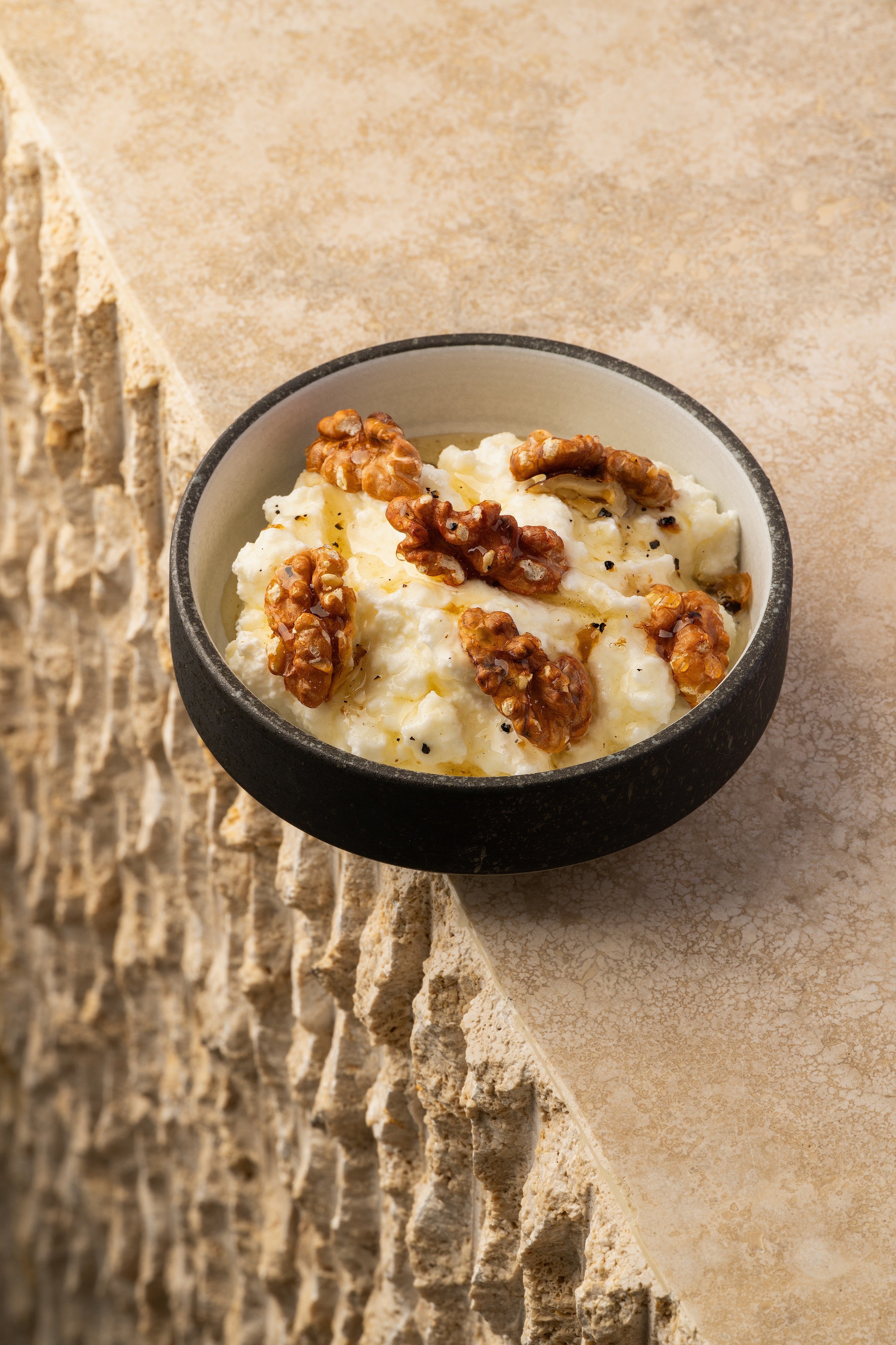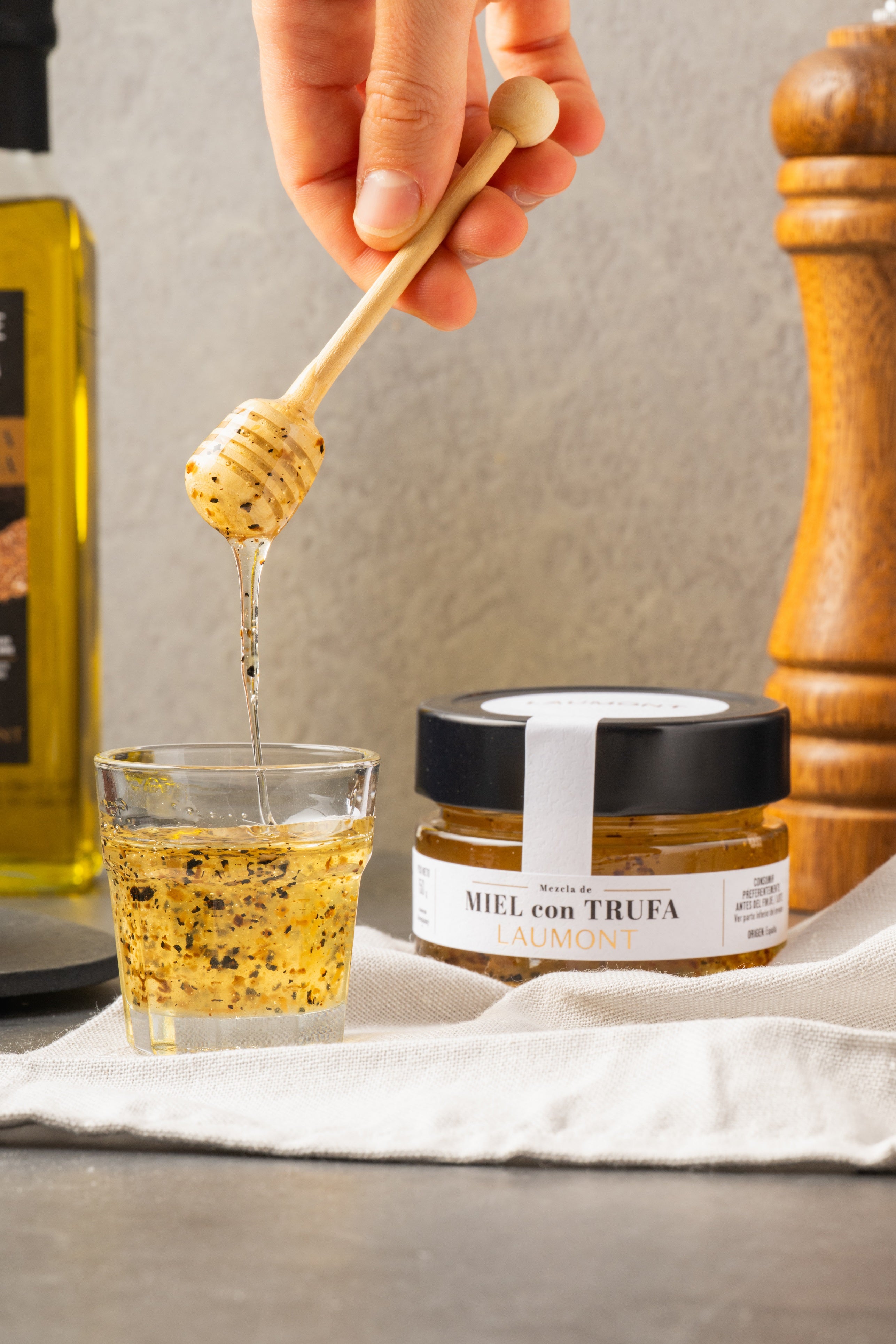 Un mató de buena calidad, fresco y cremoso, se combina con el crujiente de las nueces y el aroma elegante de la miel trufada Laumont, logrando un equilibrio delicado y sorprendente.