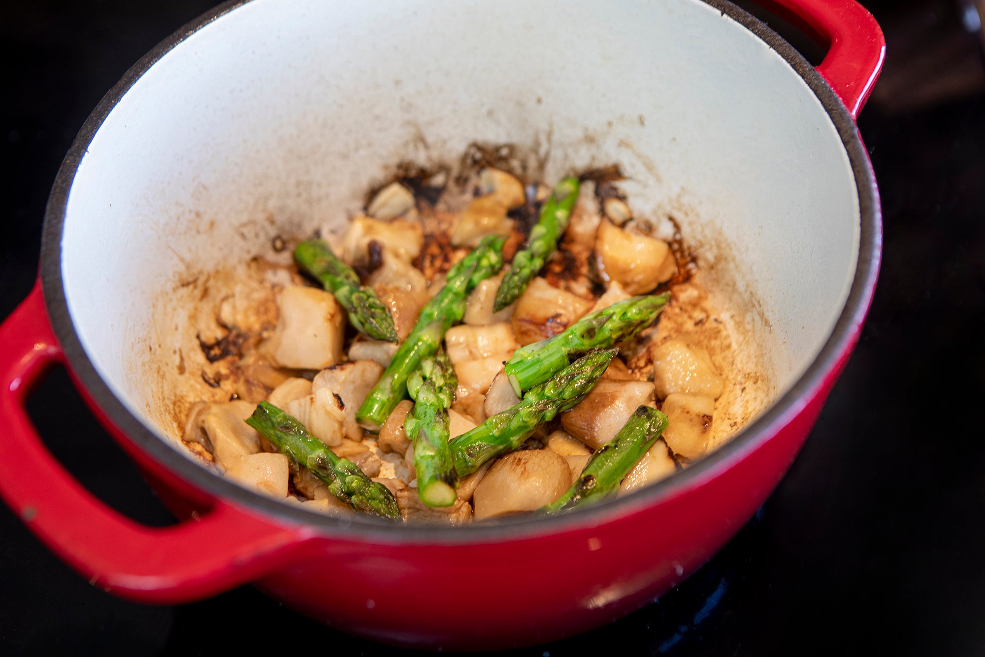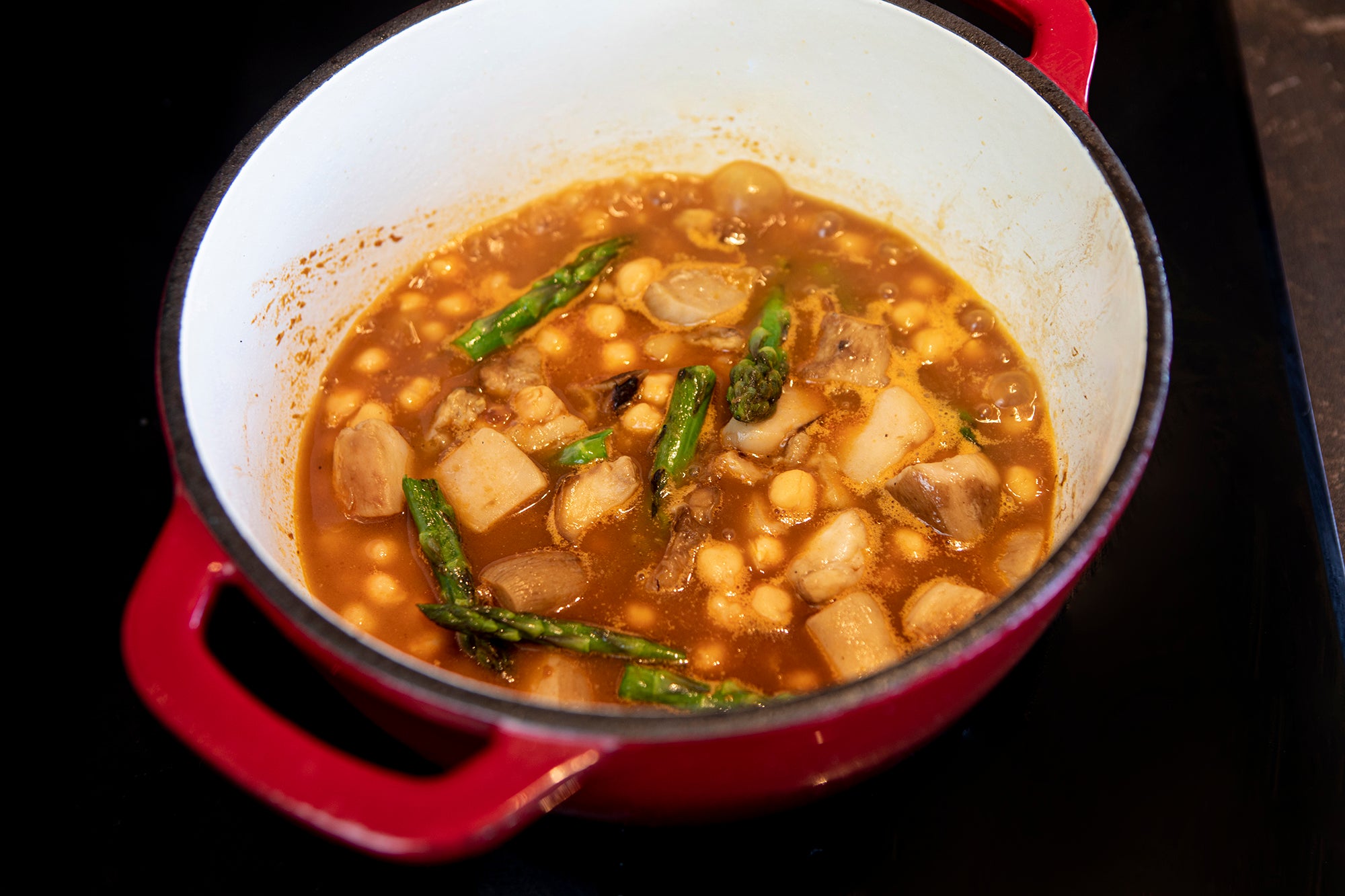 Ingredientes para el estofado de garbanzos, espárragos y boletus