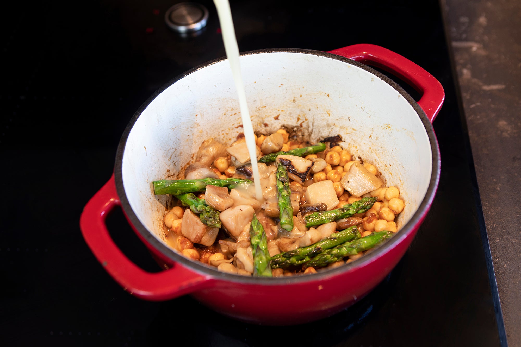 Este estofado de garbanzos, espárragos y boletus es un plato reconfortante, saludable y muy sabroso, perfecto para cualquier época del año. La suavidad de los boletus de Laumont, el dulzor del sofrito y la cremosidad de los garbanzos se combinan con el frescor de los espárragos y la textura de los guisantes. Una receta fácil de preparar, rica en fibra y proteínas vegetales, ideal para quienes buscan una cocina nutritiva y deliciosa.