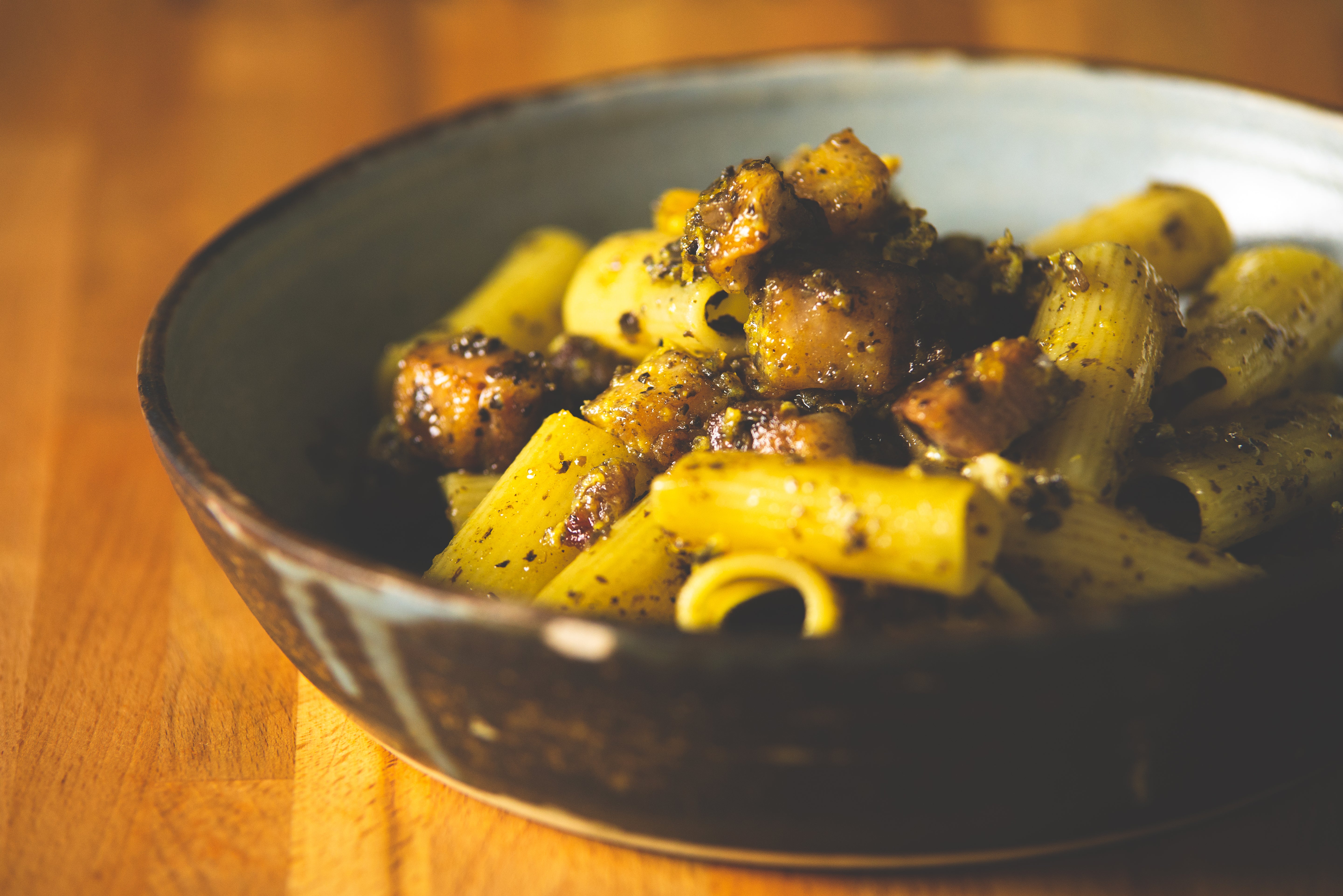 Ingredientes para los rigatonis salteados con tartufata con panceta de cerdo y yema de huevo