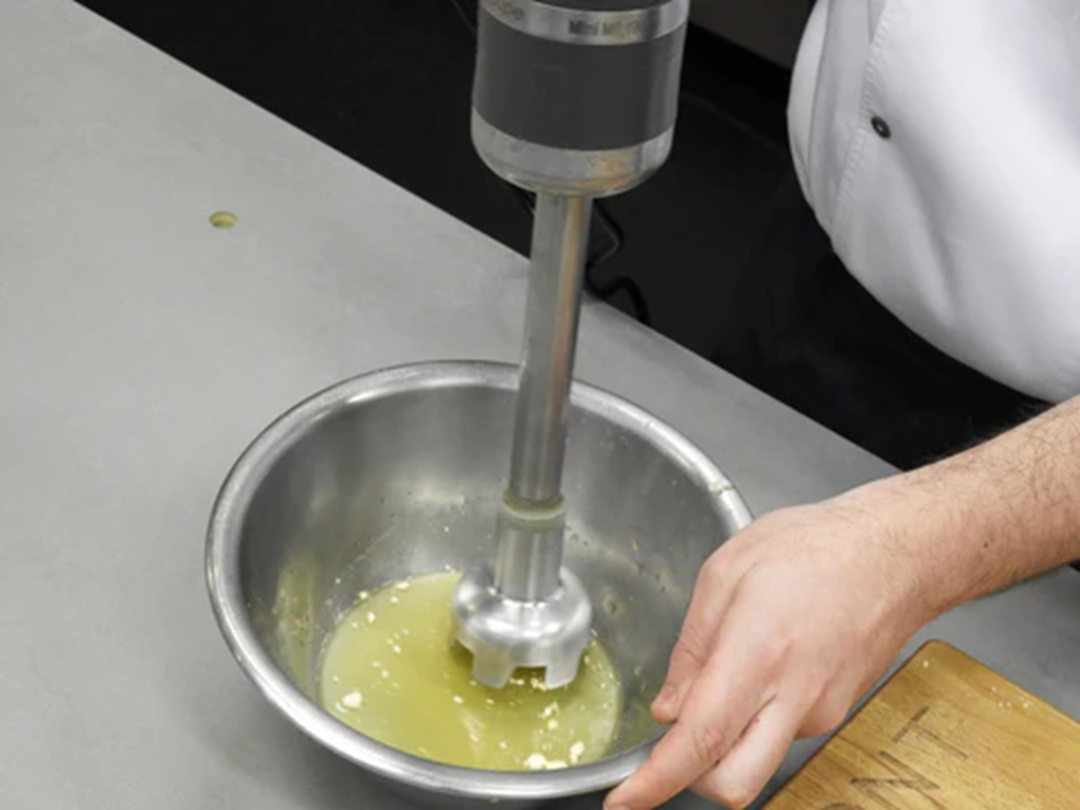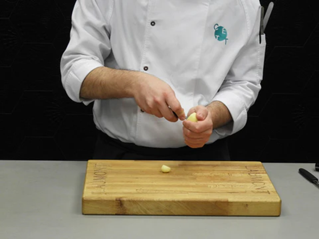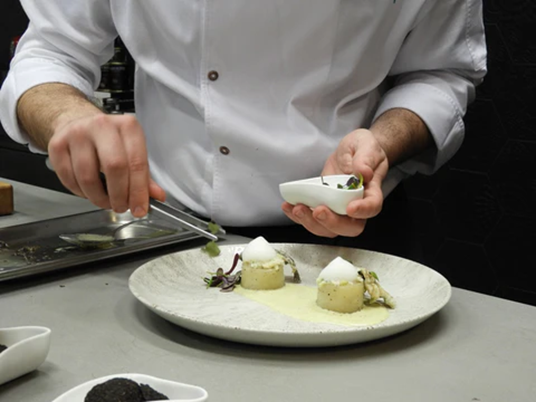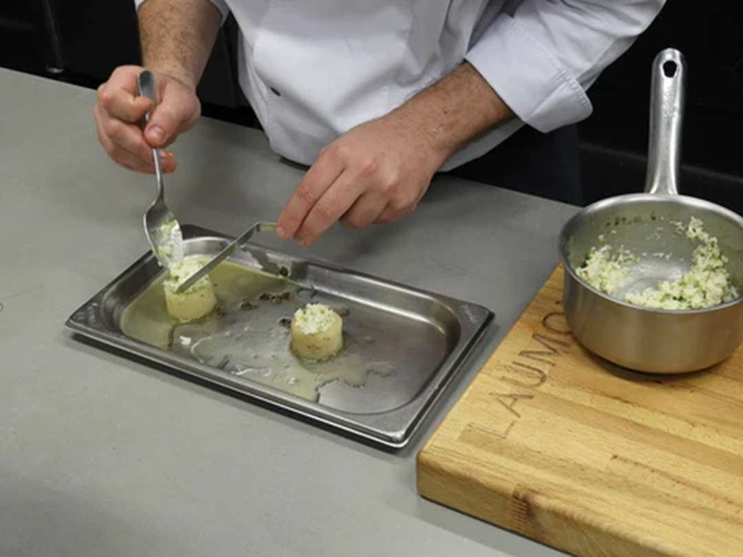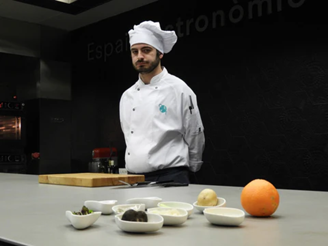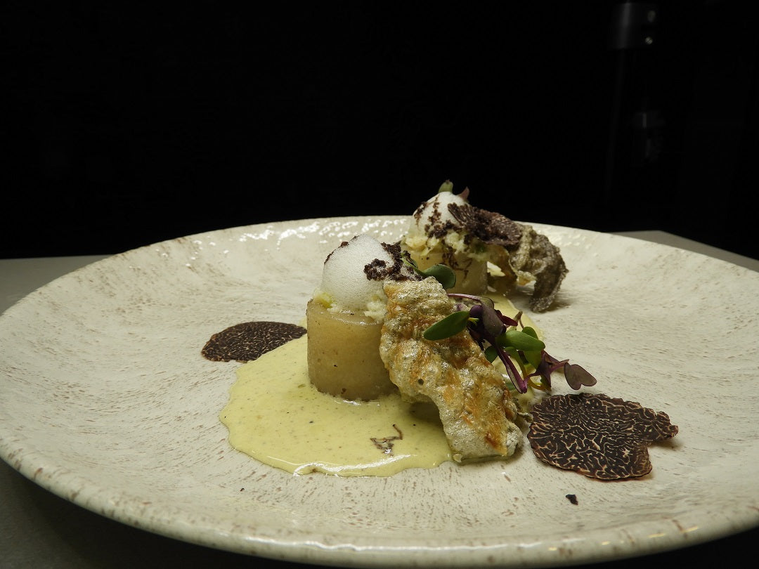 Ajoblanco trufat amb patates trufades farcides de bacallà. Inspirada a la cuina d'autor amb productes de qualitat, aquesta creació de Kilian Garcia , estudiant de l'escola gastronòmica CETT , ofereix una experiència equilibrada entre tradició i modernitat. L'ajoblanco de pistatxo i tòfona negra Laumont aporta profunditat i untuositat, que contrasta amb la frescor de l'aire cítric i el cruixent de la pell de bacallà, aconseguint una harmonia sorprenent.