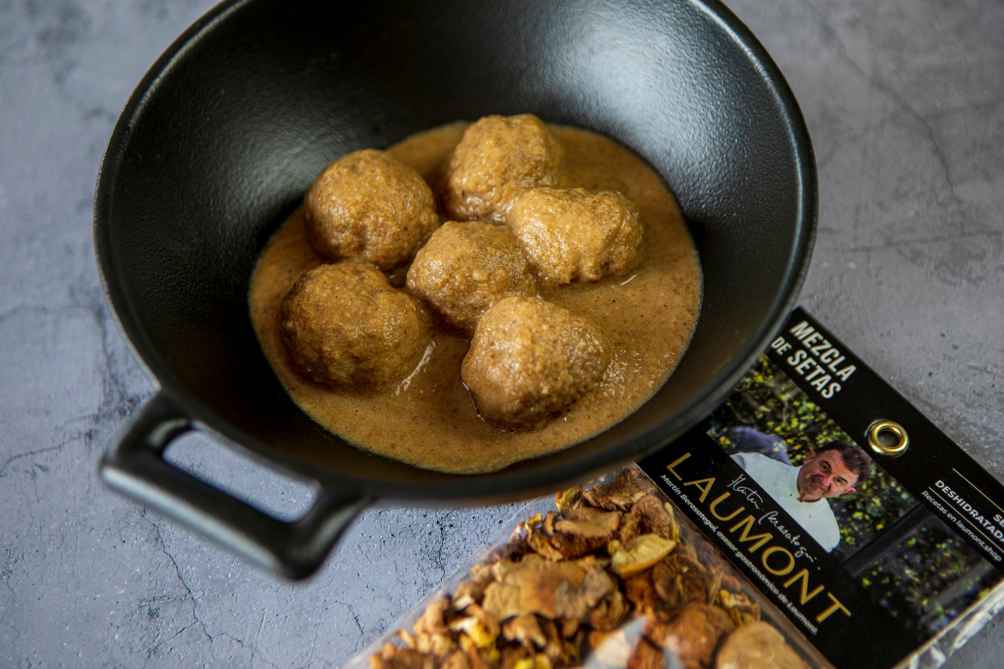 Aquestes mandonguilles amb salsa de bolets són una reinterpretació del clàssic guisat casolà, amb el segell de qualitat de la Berasategui Collection . Utilitzant una barreja de bolets deshidratats Laumont , aquesta recepta ofereix una salsa intensa i sedosa que envolta unes sucoses mandonguilles. Un plat reconfortant, saborós i perfecte per sorprendre amb sabors profunds i elegants.