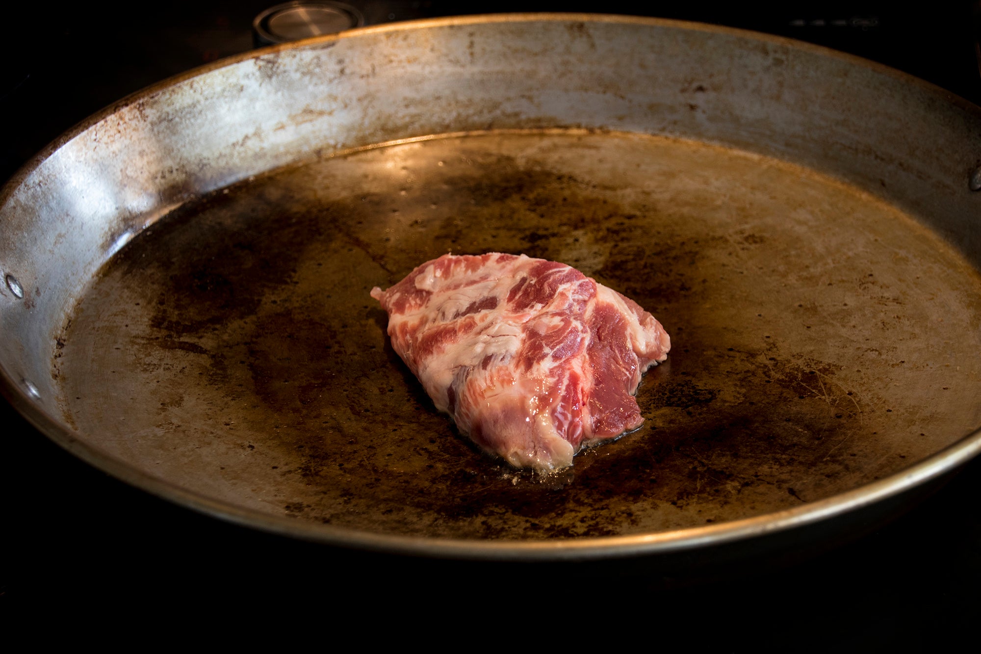- A la paella on anem a coure l'arròs, marquem la ploma ibèrica a foc mitjà-alt , un cop daurada pels dos costats, la retirem.