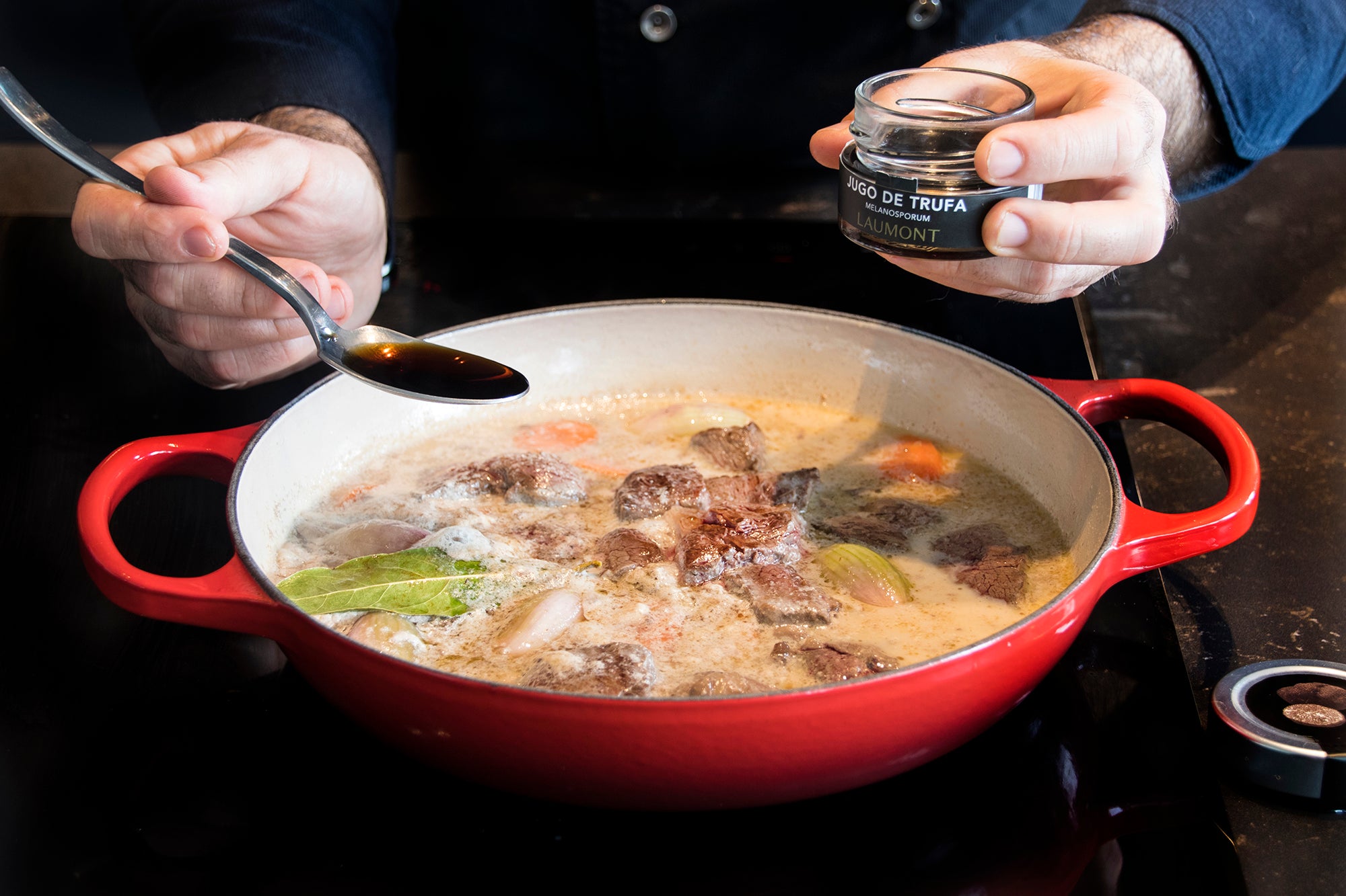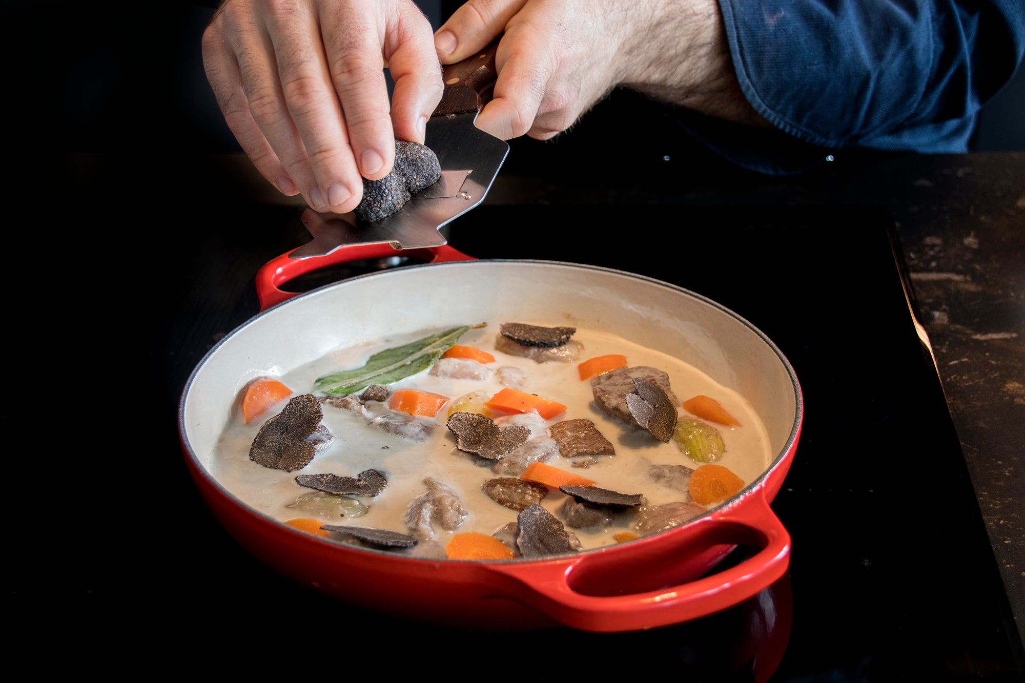 Aquesta versió trufada de la tradicional blanqueta francesa combina la suavitat de la carn de vedella cuita lentament amb l'inconfusible aroma del suc i la tòfona negra de Laumont . Una recepta càlida, saborosa i refinada ideal per als dies freds o un sopar especial.