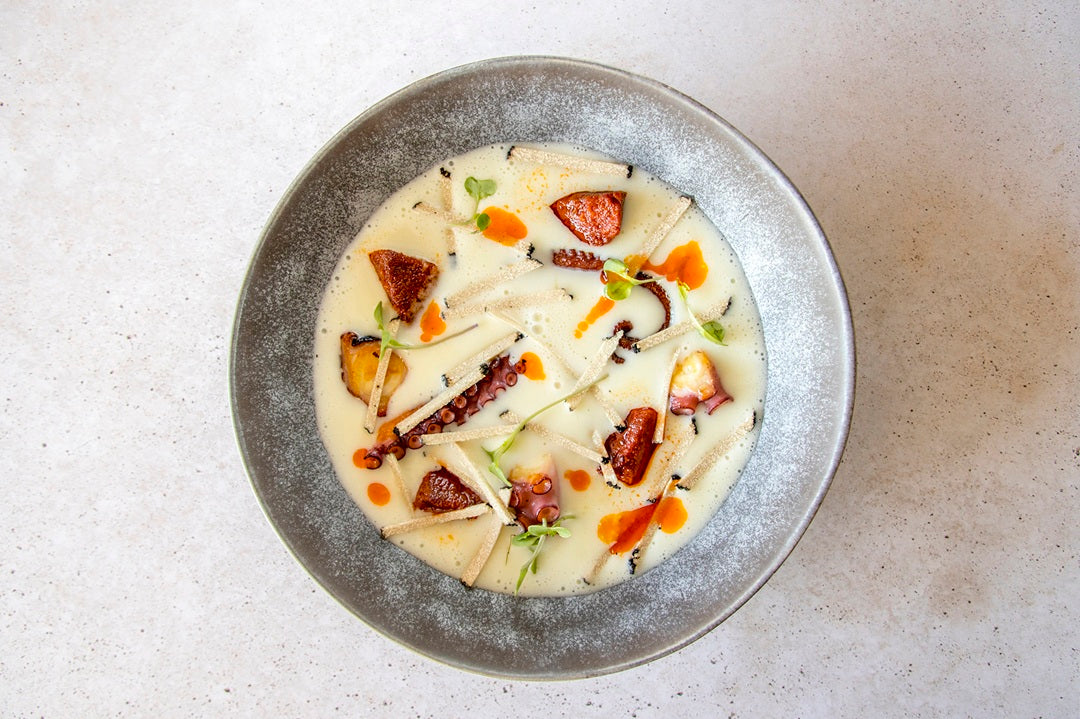 Aquest plat càlid i gurmet combina la suavitat d'una crema de patata Kennebec amb el sabor profund del pop marcat, la intensitat de la sobrassada fundent i l'aroma inconfusible de la tòfona d'estiu ratllada de Laumont . Una recepta perfecta per sorprendre amb senzillesa i elegància.