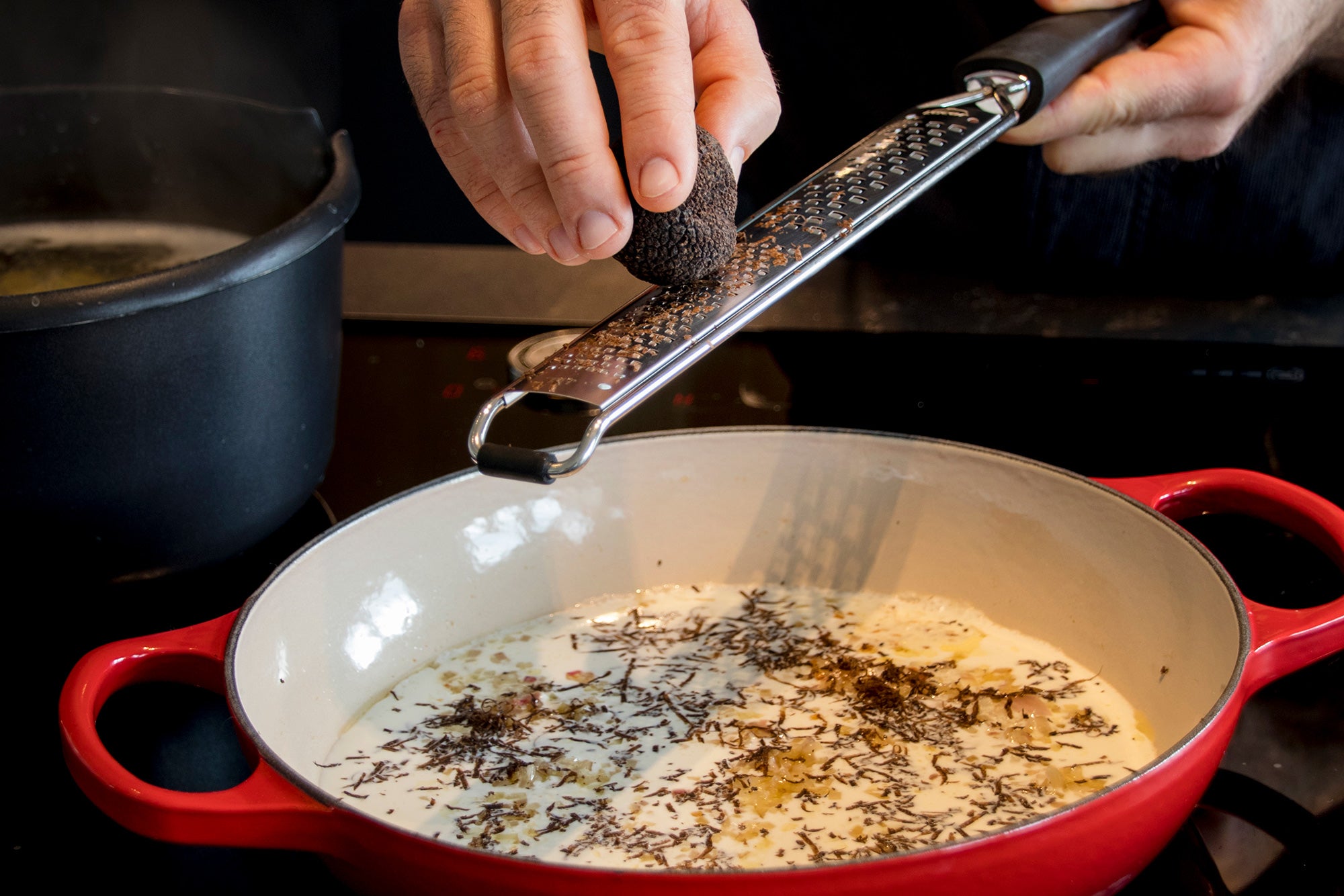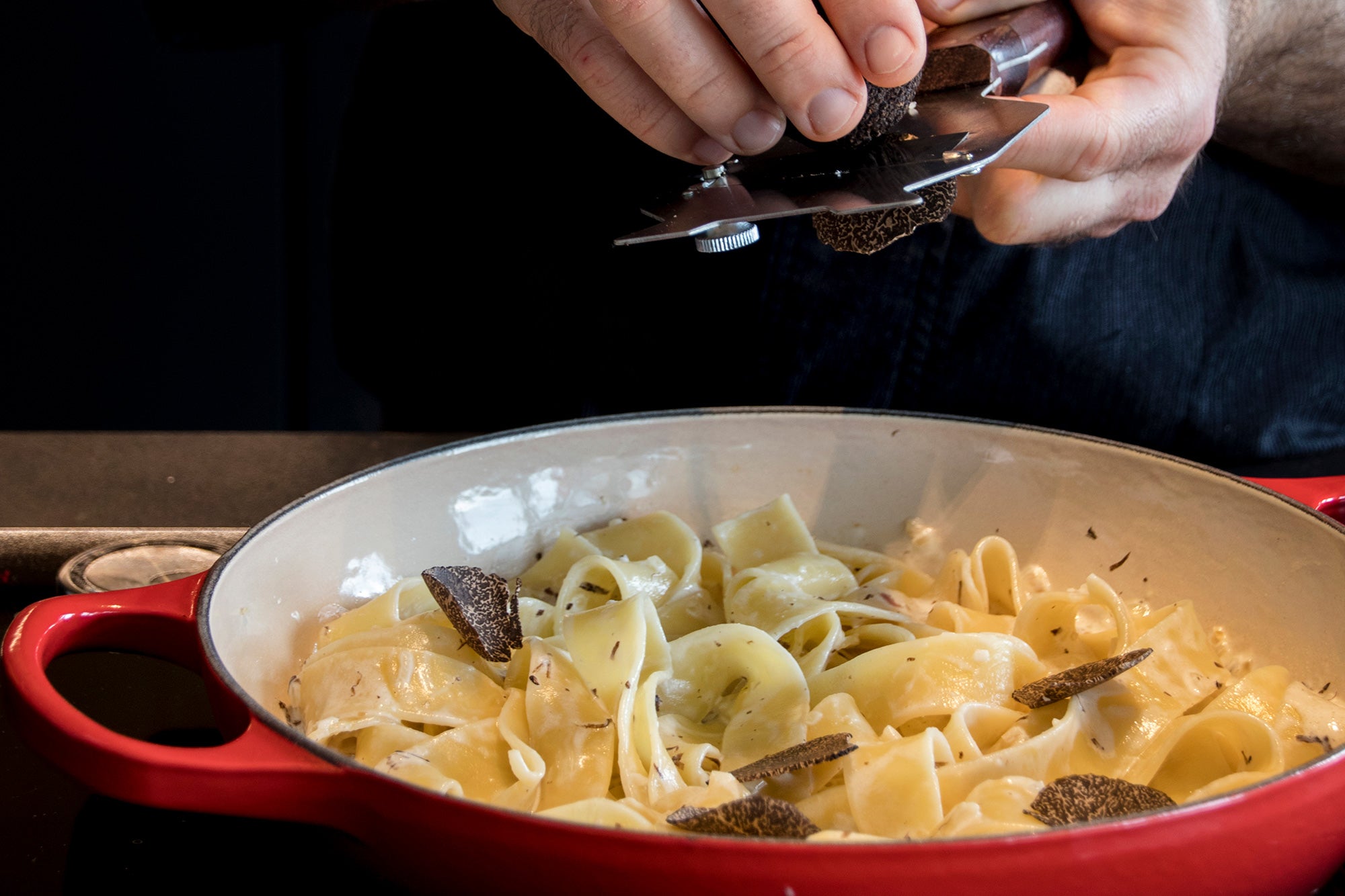 Aquesta recepta senzilla i elegant ressalta la intensitat de la tòfona negra Laumont , acompanyada d'una cremosa salsa de nata i mantega que envolta uns pappardelle al dente. Un plat ideal per als amants de la cuina amb caràcter i aroma.