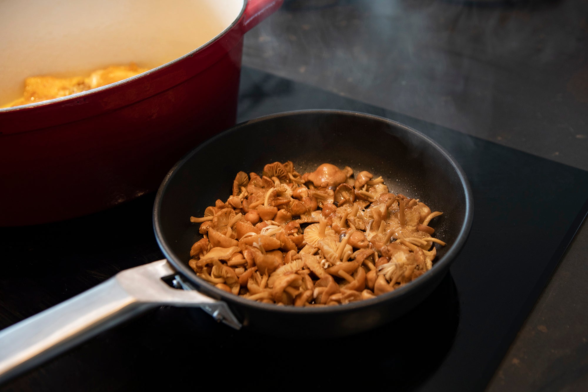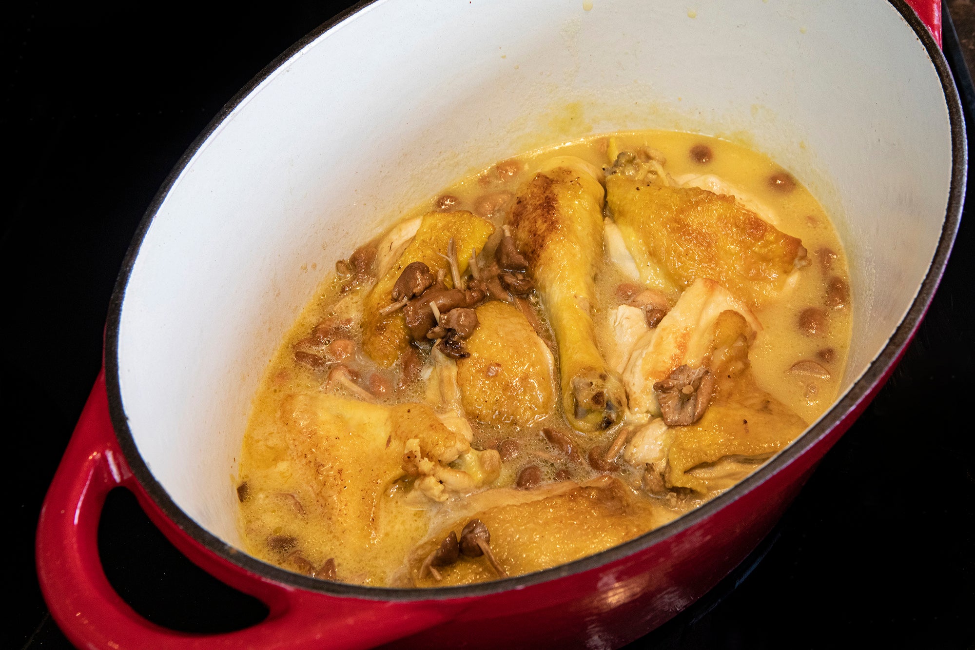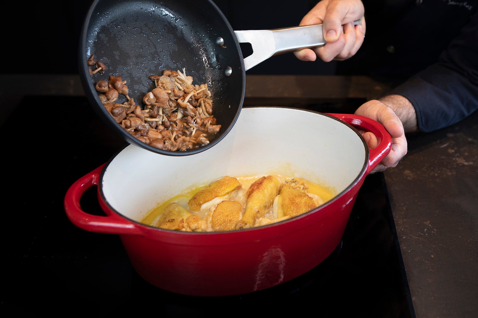 Un clàssic reconfortant de la cuina de cassola: pollastre guisat amb senderoles , un bolet silvestre molt apreciat per la seva aroma i textura. Aquest plat destaca per la sucositat, gràcies a una cocció lenta en brou de pollastre, aromatitzat amb herbes i un toc de brandi. La salsa, lligada amb creïlla, li dóna una textura cremosa sense necessitat de farines. Els camins seleccionats per Laumont completen aquesta recepta càlida i saborosa, perfecta per als mesos freds.