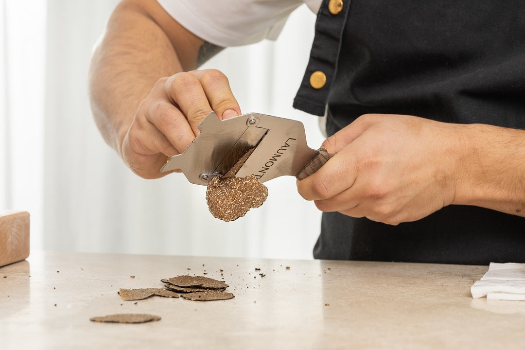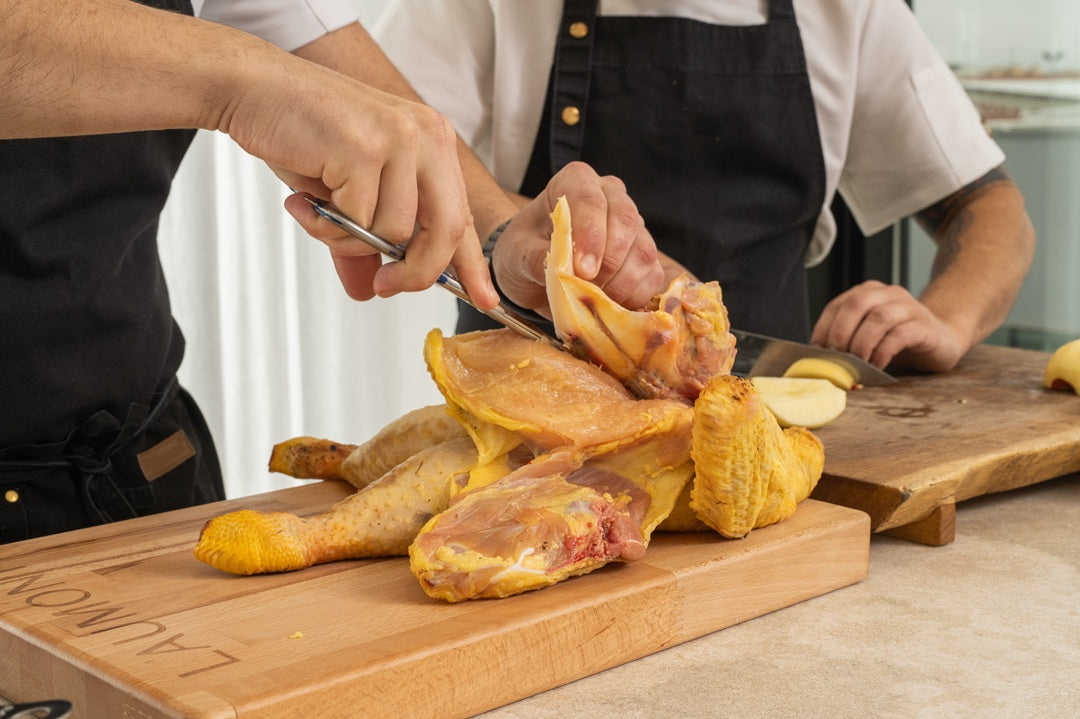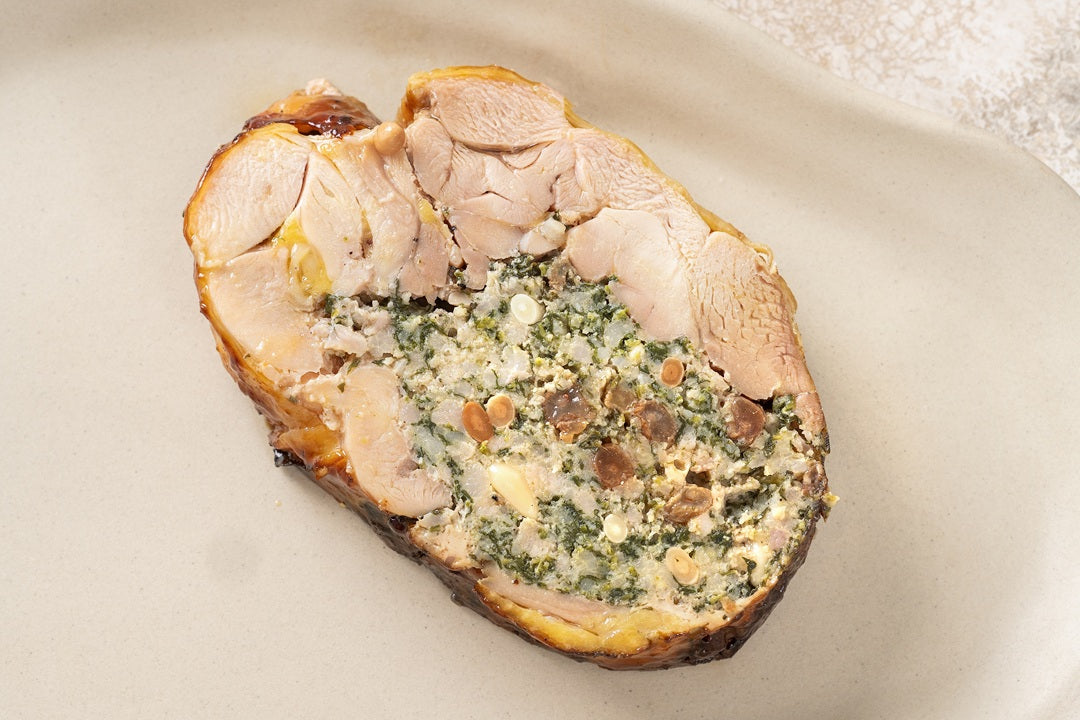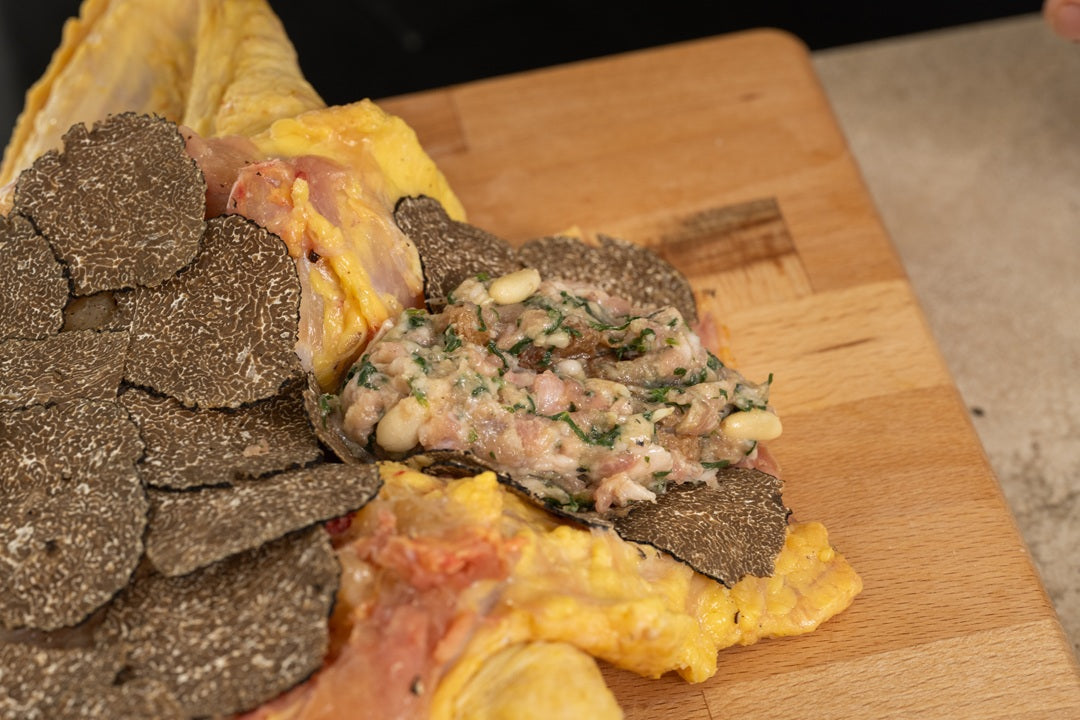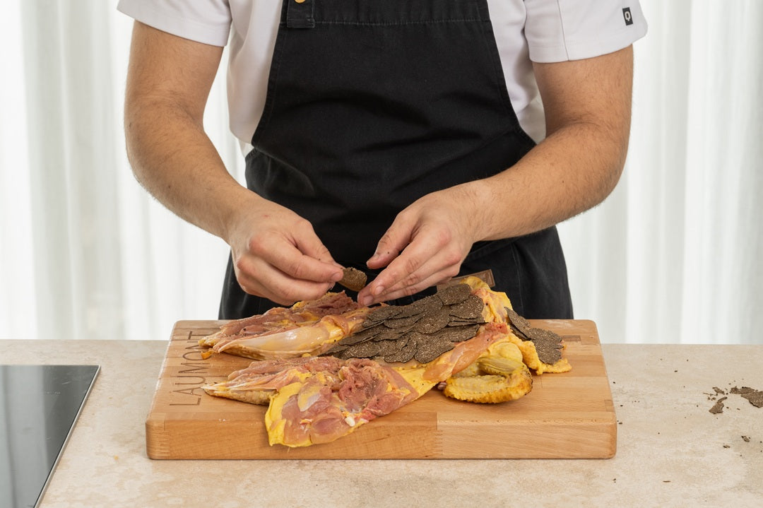 Un plat sofisticat i ple de sabors profunds, on el pollastre sucós s'omple amb un preparat català aromàtic i tòfona , cuinat al buit per aconseguir una textura perfecta i acompanyat d'un toc dolç i cruixent de poma i patata.