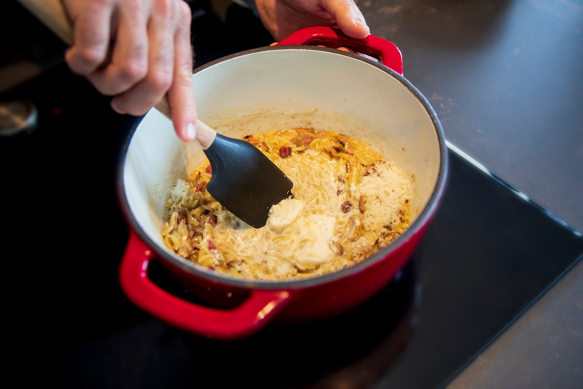 Aquest risotto de pasta amb ceps i pernil ibèric transforma la tradicional tècnica italiana en una experiència gurmet mediterrània. La textura cremosa del puntalette cuinat a l'estil risotto s'enriqueix amb ceps deshidratats de Laumont , formatge parmesà, nata i un toc final de pernil ibèric. Un plat elegant, ple de sabor, ideal per sorprendre els teus comensals en qualsevol ocasió especial.